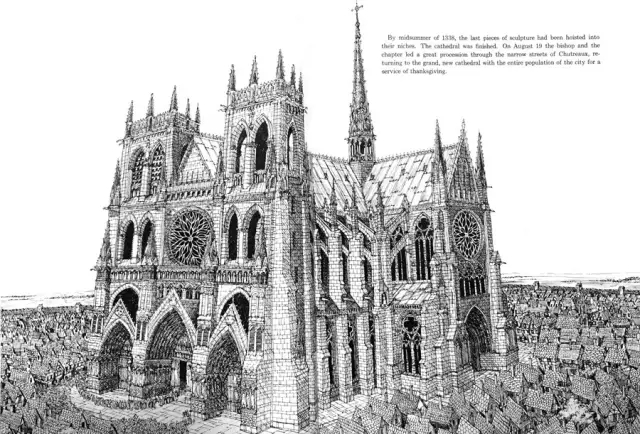 1338年的夏天,最后一块雕刻安放到位——大教堂终于完工了!8月19日这天,主教和教士团带领长长的队伍走上台阶,来到他们宏伟的大教堂,整个Chutreaux城的人都聚到这里感恩上帝。