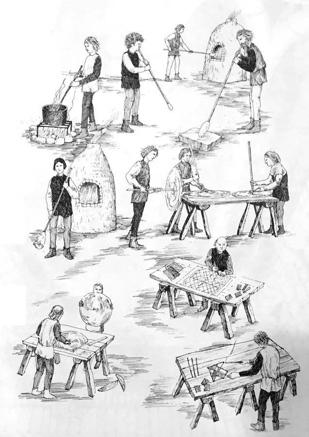 彩窗的建造被提上了日程。玻璃工匠用高温烧熔榉木灰和砂子的混合物,加入不同金属以获得斑斓的色彩。然后,工匠会舀出一勺熔融物,用长管吹成一个气球,切下来摊开成为圆形的玻璃片。再根据桌面上画好的等比例图案把它们切好、摆好。