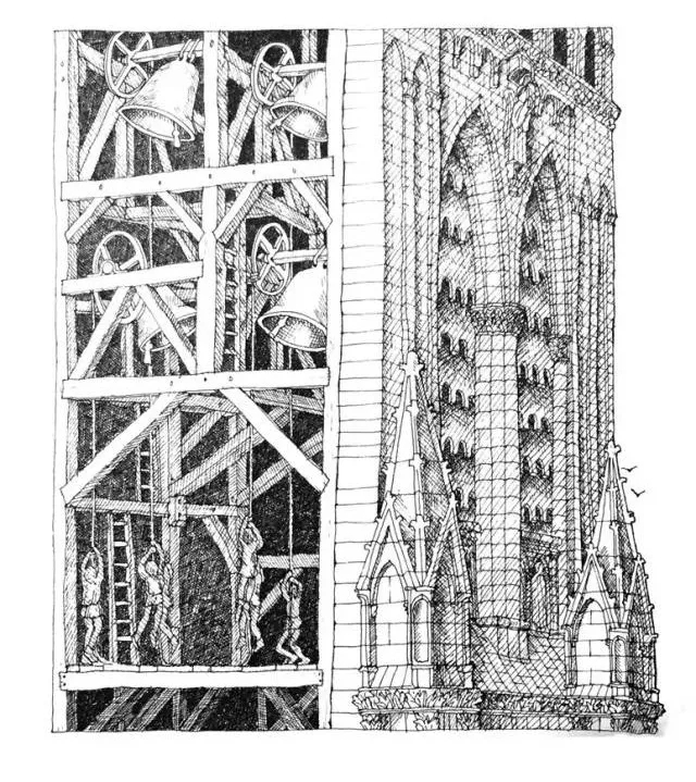 在北塔上,人们正在安装巨型构架悬挂大钟,钟声敲响时方圆数英里的人们都可以听见。