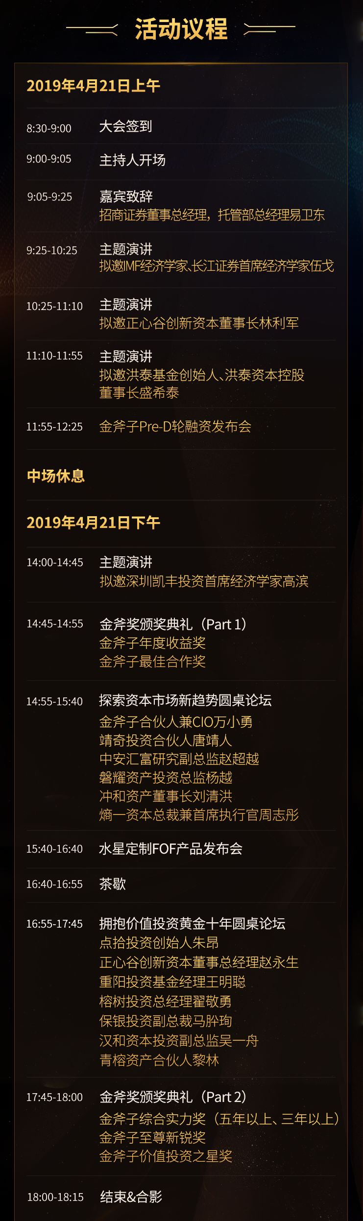 本届大会还将颁发2018年年度金斧奖,金斧子深入研究市场上4000多家私募机构旗下的10000多只产品,严格审核、匠心评选出“年度收益奖”、“最佳合作奖”、“综合实力奖”、“至尊新锐奖”、“价值投资之星奖”五大金斧奖!