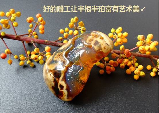 还有一种和半蜜半珀很像的品种,叫半根半珀,因形成过程中掺入了方解石成分,而被严重石化,是缅甸根珀的一种。