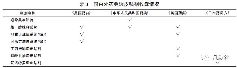 由于透皮贴剂是较新的剂型,不同企业的处方工艺不同,质量控制方法差异较大,以各家企业自行拟定的质量控制标准为主,各国药典收载的品种较少,如表3 所示。