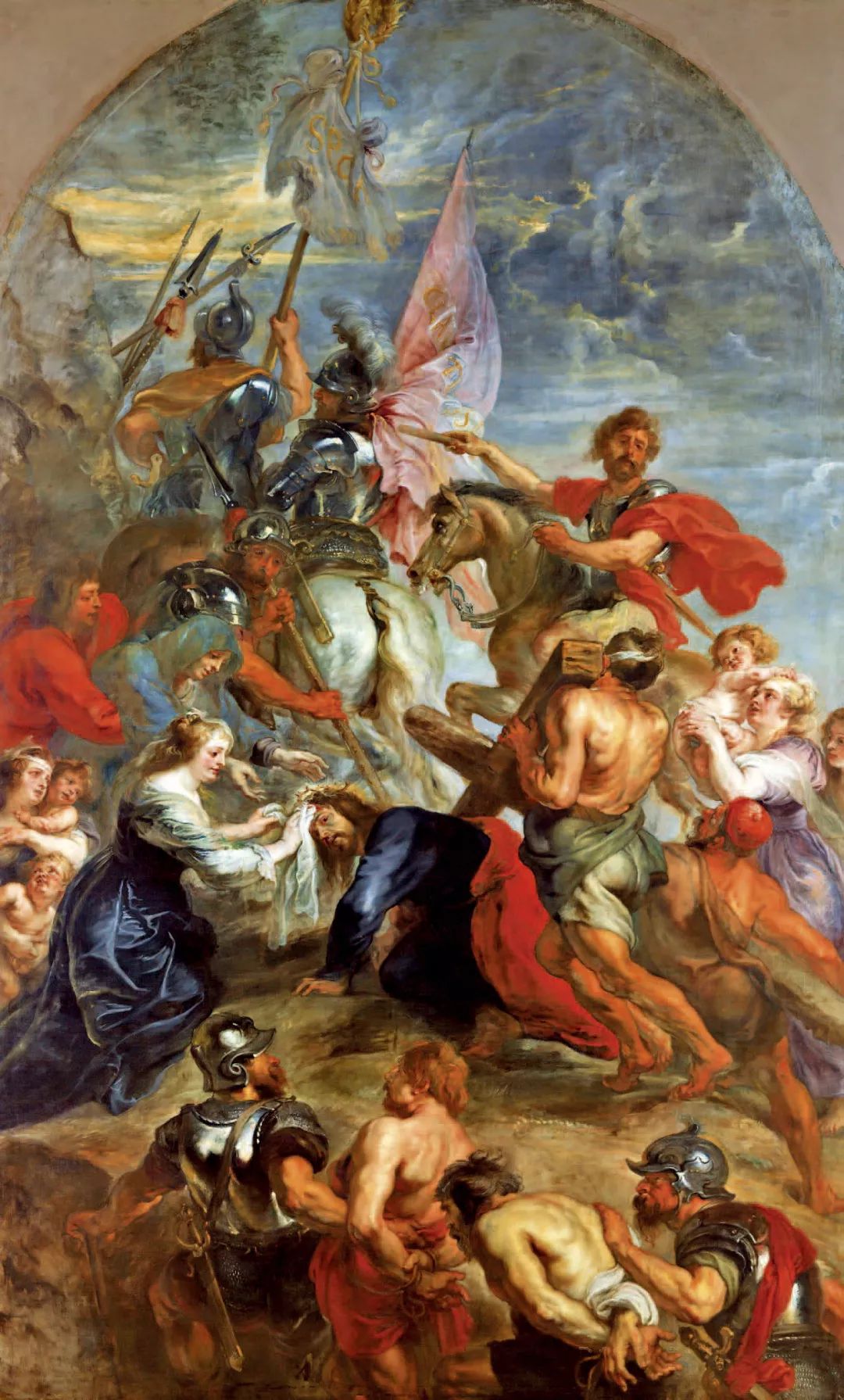 全部的人物与马匹都是美丽的精壮的。强盗与押解的士兵的肌肉有如拳击家般的。西蒙·勒·西莱南用尽力量举着将要压在耶稣身上的十字架。队长是一个面目俊爽的美男子——人家说这无异是鲁本斯的肖像——他的坐骑亦是一匹雄伟的马。圣女佛洛尼葛是一个容光焕发的盛装的美女。圣母是一个穿着孝服的贵妇。即是耶稣亦不像一个经受过无数痛苦的筋疲力尽的人,如在别的绘画上所见的一般。在此,他的面目很美,从他衣服的褶痕上可以猜想出他的体格美。
