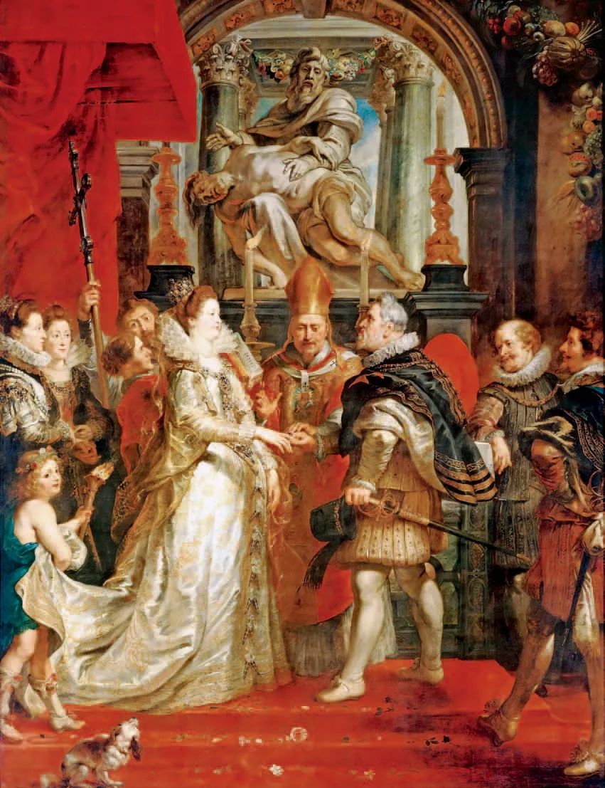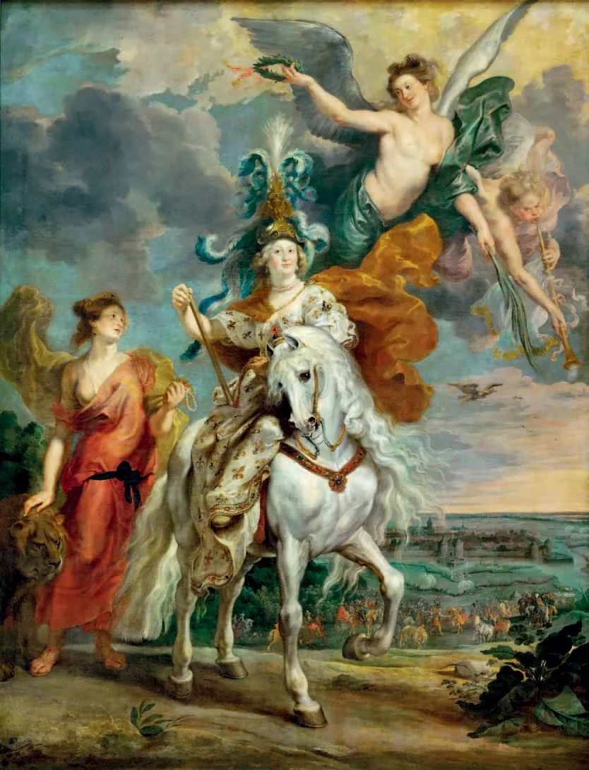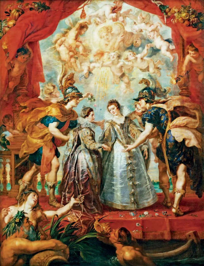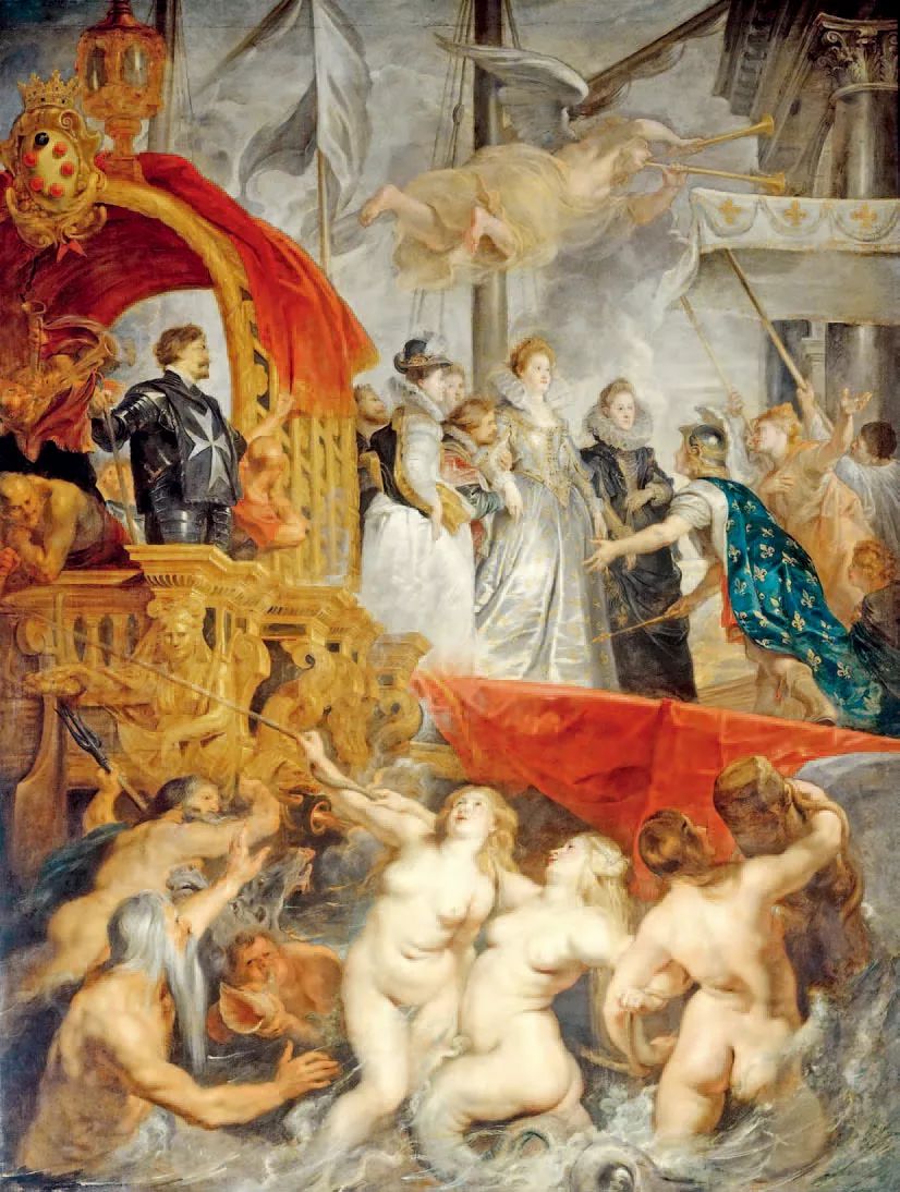 这种把题材夸大、把一幕日常景色描写得越出通常范围的方法,使鲁本斯在所谓“梅迪契廊”一组英雄式的描写中大为成功。这是亨利四世的王后的历史,一共分做24段,即24个件故事。其中,一切是雄伟的,一切是神奇的。三个Parques神罗织王后的命运。美惠女神与米涅瓦(Minerve)神预备她的教育材料。雄辩之神把她的肖像赉送给亨利四世。朱庇特(Jupiter)、朱诺(Junon)、米涅瓦三神参与他们的会见,忠告法王。在描写王后到达马赛的一画中,全是海中的神道护卫着。