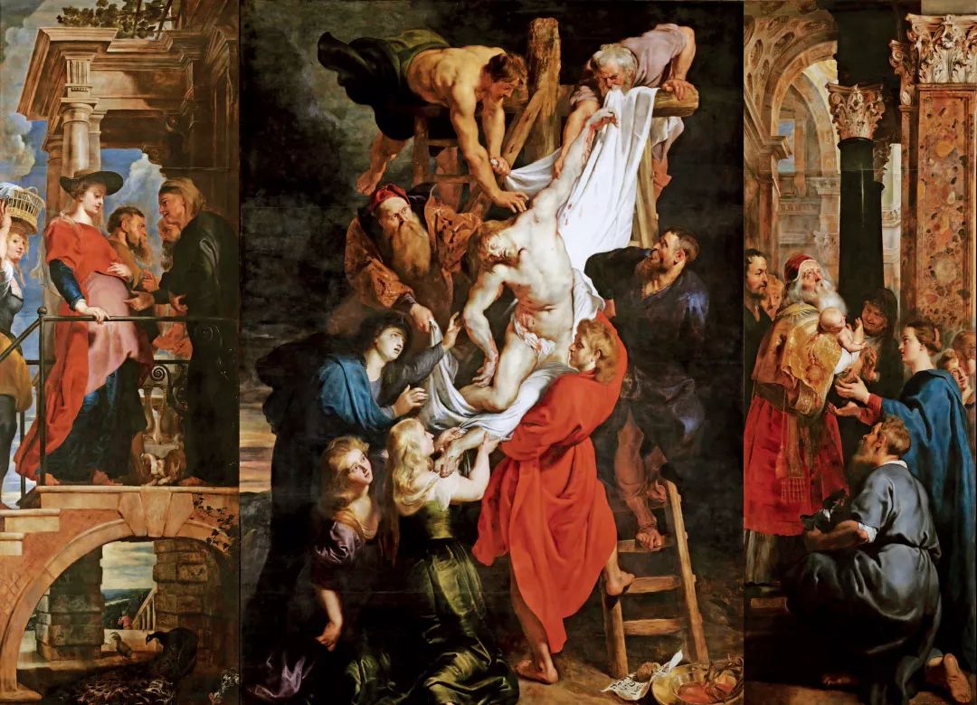 本讲中,原作者对鲁本斯的作品主要作形式上的分析,而对内容未加解释。这不仅是因为形式分析在艺术欣赏中的重要,且彼时已然成为西方美术史研究的主要方法,也因为宗教题材对法国学生而言大多耳熟能详,不必再说明。比如《抬起十字架》《基督下十字架》《东方民族膜拜圣婴》都是《圣经》中的常见题材。