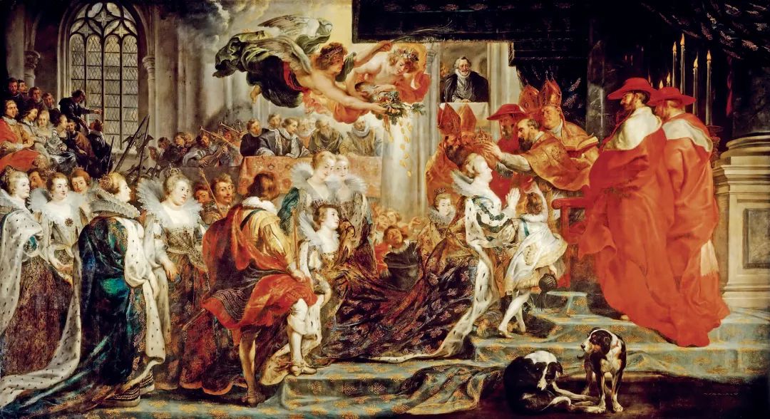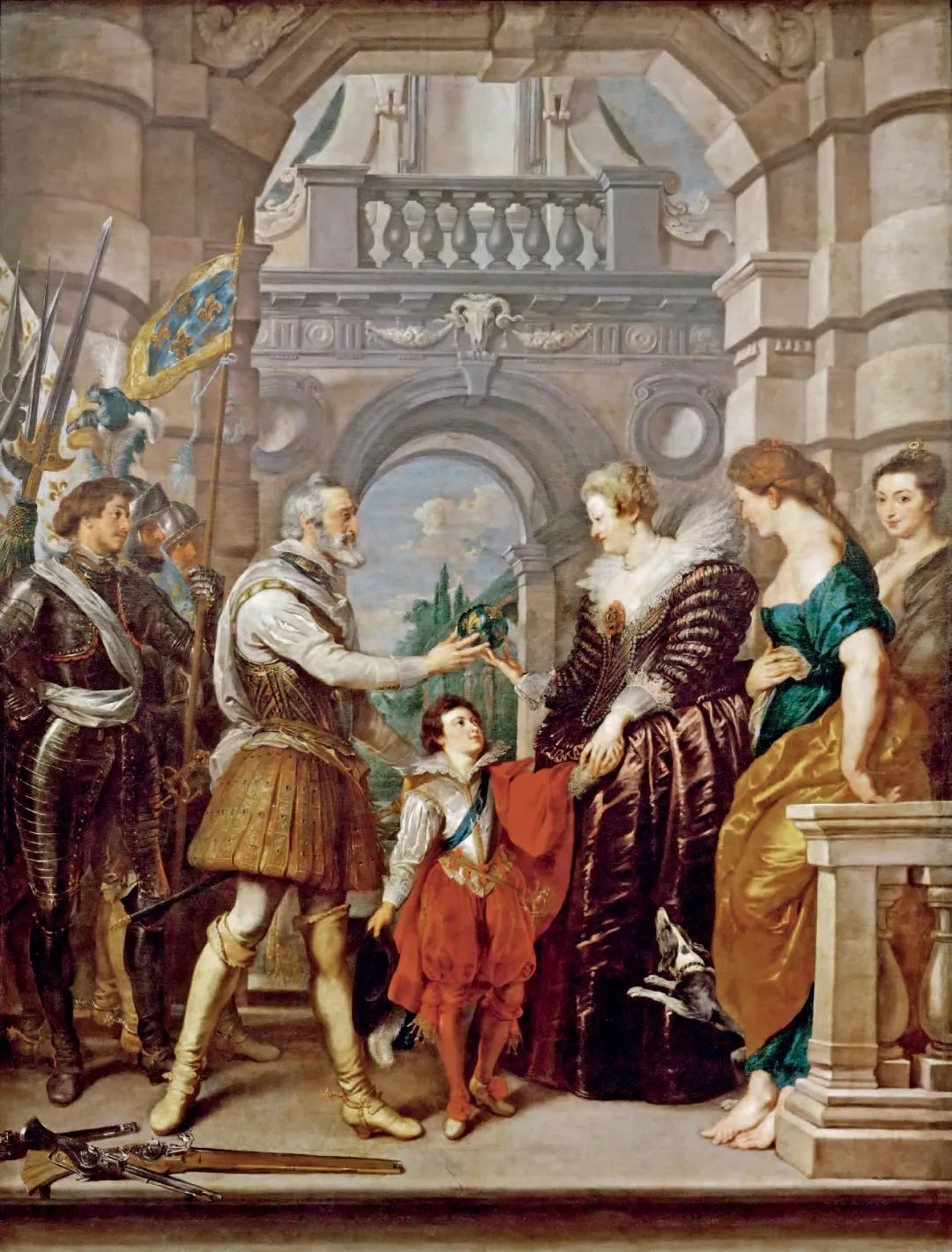 此画是鲁本斯为玛丽王后绘制的“美第奇廊”24幅作品中的第9幅,又名《委以摄政》。画面大意是亨利四世在出征之前,把象征“王国所有的权利”的蓝色小球委托给王后,让她代为摄政。站在中间的小孩是王子路易(十三)。亨利四世(1553—1610),法国国王,也称亨利大帝,波旁王朝的创建者,1589年至1610年在位,他所采取的一系列政策奠定了法国百年强盛的基础。
