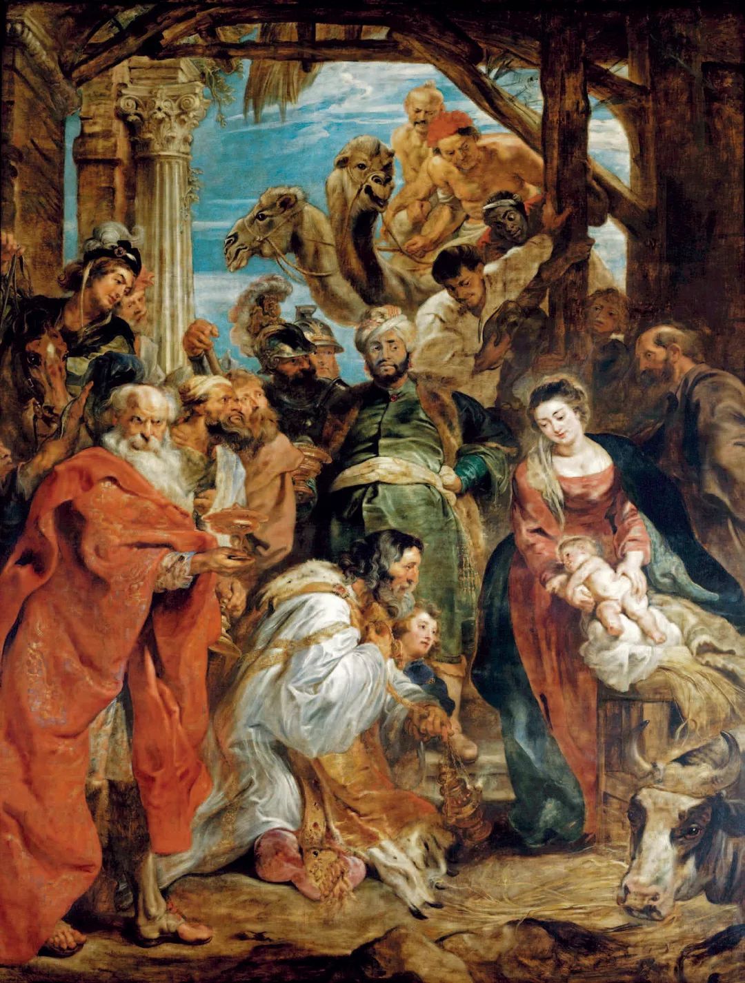 安特卫普所藏的《东方民族膜拜圣婴》一画,在表现群众拥塞于厩舍门口时,种种复杂的画意衔接得十分紧凑。在背景上是骆驼的长颈丑脸与赶骆驼的非洲土人。稍近之处是黑人的酋长。但为填塞这后景与前景之间的空隙起见,柱子上又围绕着若干奇形怪状的人首。更前处,长须的长老与奇特的亚洲人群。最前景则是欧洲的法师跪献着礼物。