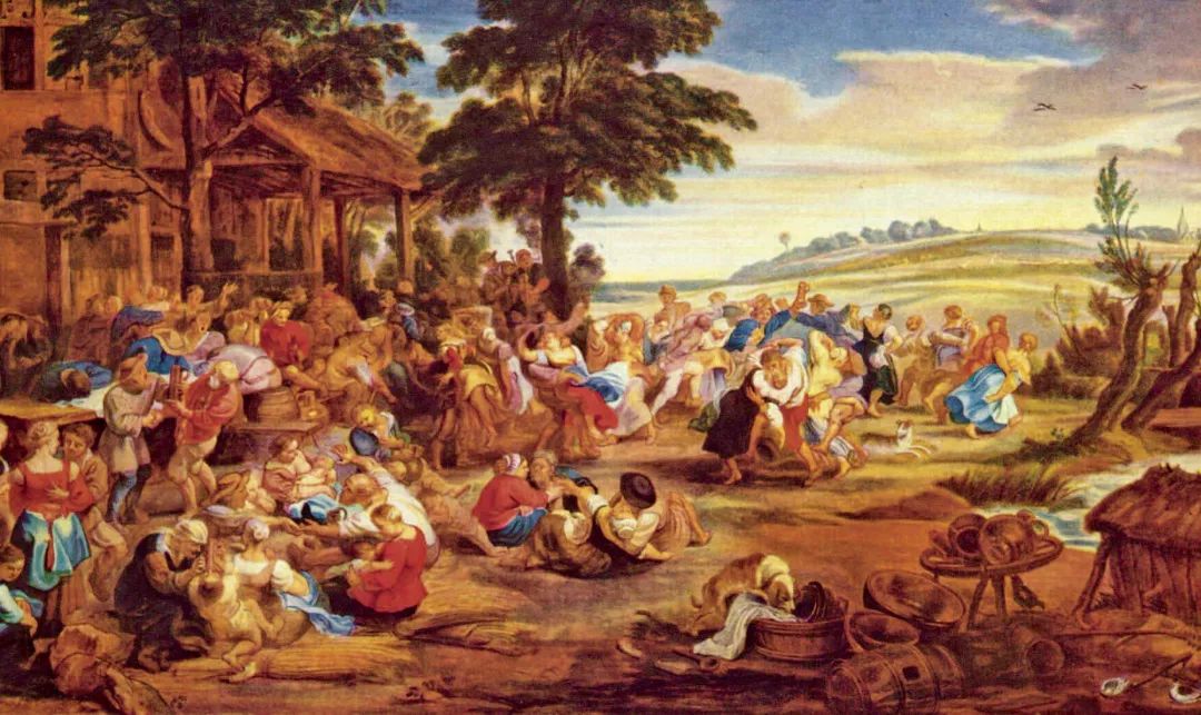 卢浮宫中的一幅名画《乡村节庆》,更能表达线条的效力。整个题材依了一条向地平线远去的线条发展。为要把线条的极端指示得格外显明起见,鲁本斯把它终点处的天际画得最为明亮。由此,图中的舞蹈显得如无穷尽的狂舞一般。其他次要的线条亦是倾向于上述的中心线条,以至全体的动作变得那么剧烈,令人目眩。同时代的名画家泰尼斯(Téniers)颇有不少同类的制作:它们是简明、典雅、色彩鲜艳,而且较为真实得多,但这是滑稽小说中的景色,不似鲁本斯的《乡村节庆》般,宛似史诗的一幕。