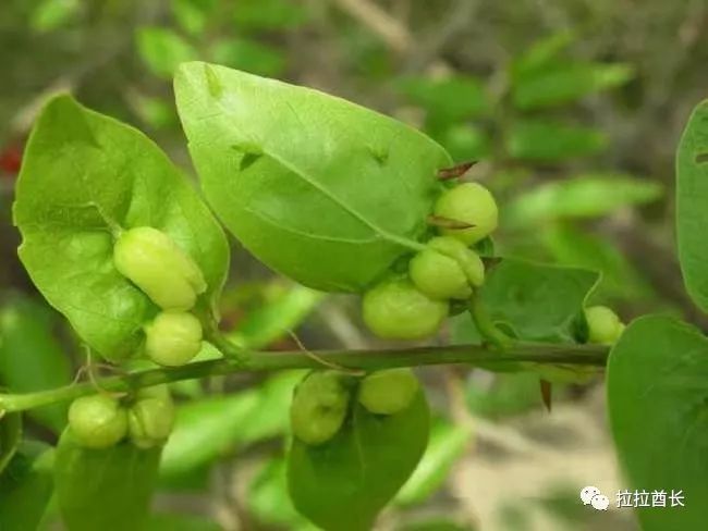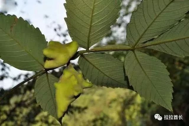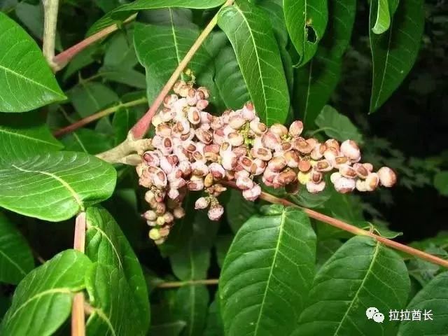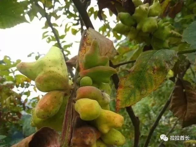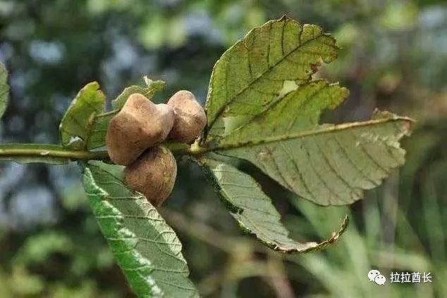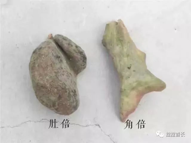 《本草纲目》:“虽知生于肤木之上,而不知其乃虫所造也。肤木,即盐肤子木也。此木生丛林处者,五、六月有虫如蚁,食其汁,老则遗种,结小球于叶间,正如蛅嘶之作雀瓮,蜡虫之作蜡子也。初起甚小,渐渐长坚,其大如拳,或小如菱,形状圆长不等。初时青绿,久而细黄,缀于枝叶,宛若结成,其壳坚脆,其中空虚,有细虫如蠛蠓。山人霜降前采取,蒸杀货之,否则虫出必穿坏,而壳薄且腐矣。”