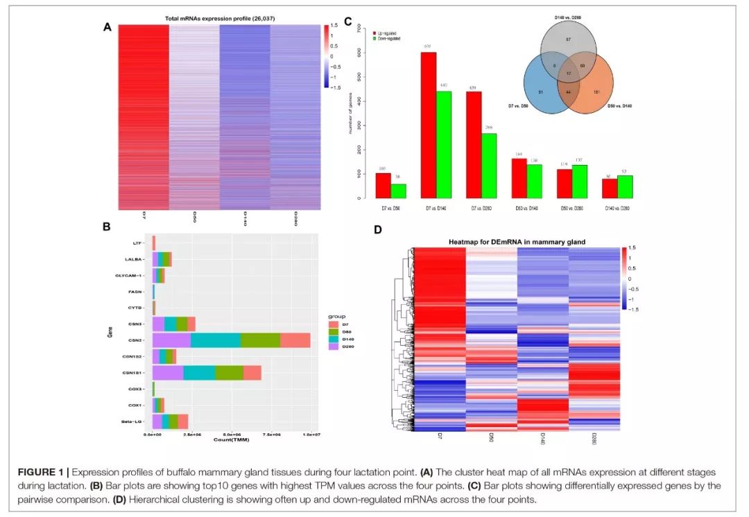 转录组测序:生产后7天(D7)、50天(D50)、140天(D140)、280天(D280)的乳腺组织,每个时间点2个重复,其中D7代表泌乳早期、D50代表泌乳高峰期、D140和D280代表泌乳中期和后期。用乳腺组织提取RNA,构建转录组文库,Illumina HiSeq 2000测序。
