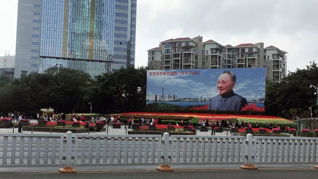 深圳市主干道深南路与红岭路交叉路口,矗立着一幅巨型邓小平画像:在蓝天白云的衬托下,邓小平微微侧身,目光和蔼,身旁簇拥着青草绿树和杜鹃花,身后的现代化建筑直插云霄,左上方写着“坚持党的基本路线一百年不动摇”14个红色大字。到画像前留影已成游客必选项目,一位大叔埋怨着孩子们对身边的景色无动于衷,另一个大妈正在热切地张罗着亲友合影留念。