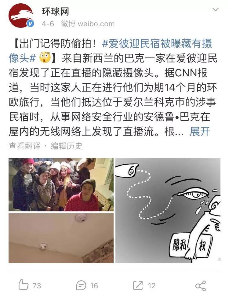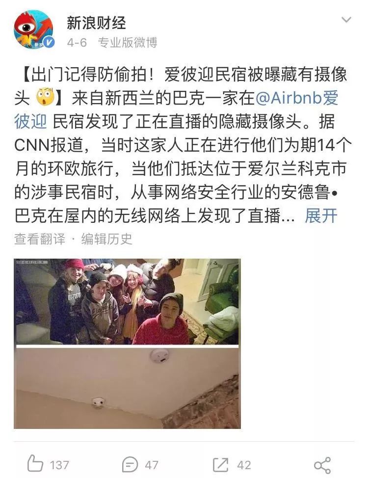 不仅如此,爱彼迎此前还被暴露出安全管理问题,比如在民宿内发现了直播摄像头,住客的隐私安全受到极大威胁。