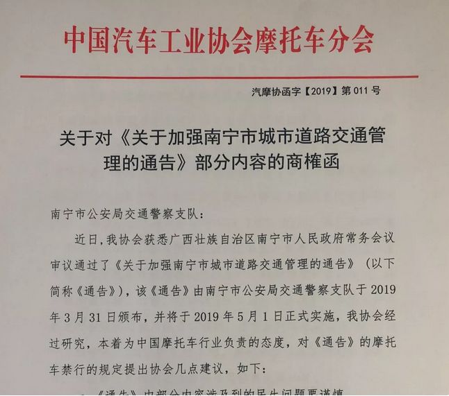 对于这项即将实施的规定,南宁摩托车分会致函南宁市公安局交通警察支队,建议《通告》中,涉及“禁限摩”等关系民生的问题需要谨慎考虑,避免引发社会舆论的争执。并指出“禁限摩”是缺乏法律依据的。我国摩托车工业具有巨大的发展潜力,摩托车工业的发展,不仅关系着“国家稳增长,拉动内需”的宏观政策导向,也与人民群众的幸福感息息相关。
