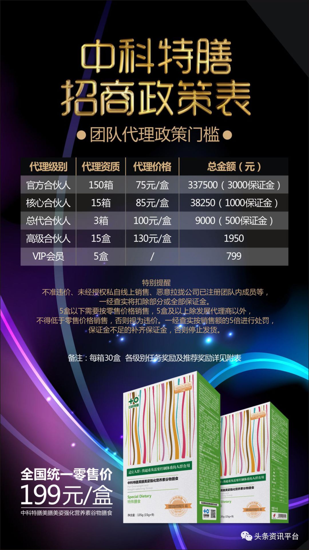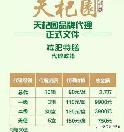 据悉,此前的中科特膳的级别和门槛都与现在的制度有所不同,当时的代理制度规定代理商的级别分别为:天使(5盒,总金额780元)、一级(1箱,总金额3450元)、总代(3箱,总金额8550元)、核心(15箱,总金额3.6万元)、官方(100箱,总金额21万元)。顺带一提,在该版本的中科特膳代理制度中,代理级别的名称与当年天杞园代理制度中的代理级别名称十分相似。