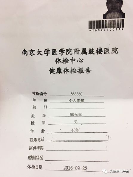 陈光标称自己从未做过任何减肥手术,身上也没有任何刀疤或孔眼,并且出示了在南京鼓楼医院的体检报告。这份体检日期为“2016年9月22日”,“南京大学医学院附属鼓楼医院体检中心健康体检报告”显示,内科检查“未见手术疤痕”,在外科项目“手术”栏目中,检查结果为“无”,一共两页。
