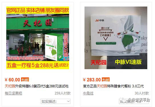 而事实上,除了微商渠道,在淘宝上,我们也找到了这款天杞园特殊膳食,但其价格比美康汇一盒2980元的标价要亲民得多。
