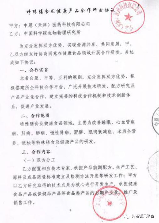 据代理商小梅(化名)介绍,这款产品一共经历了四个版本,分别是1.0、2.0、3.0和4.0-4.5。前几个版本是中恩与天杞园合作,给产品打上了天杞园的牌子,因后期操盘手的问题,加之双方合作合同到期,于是双方停止合作,这款产品也进入到了4.0-4.5的版本,就是如今冠以中科院的名义进行宣传的中科特膳。