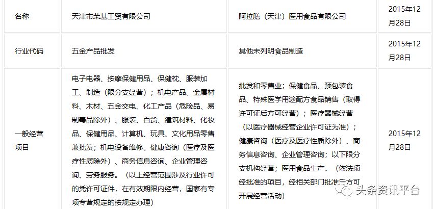 接下来,说说中科特膳与阿拉膳的关系。据工厂网显示,阿拉膳(天津)健康科技集团有限公司成立于1998年,原名天津市荣基工贸有限公司,刘建斌担任该公司法定代表人与董事长。在2015年年末公司改名阿拉膳之前,天津荣基的行业代码是五金产品批发,而中科特膳便是阿拉膳投资的第一家企业。2016年,中科特膳(天津)医用食品有限公司与中科特膳(天津)健康科技有限公司相继成立。