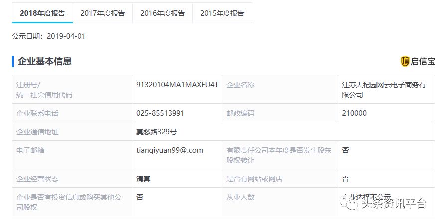 江苏天杞园网云电子商务有限公司成立于2015年,法定代表人卢洪波,注册资本1562.5万元。据其2018年年度报告显示,目前该企业的经营状态为“清算”。