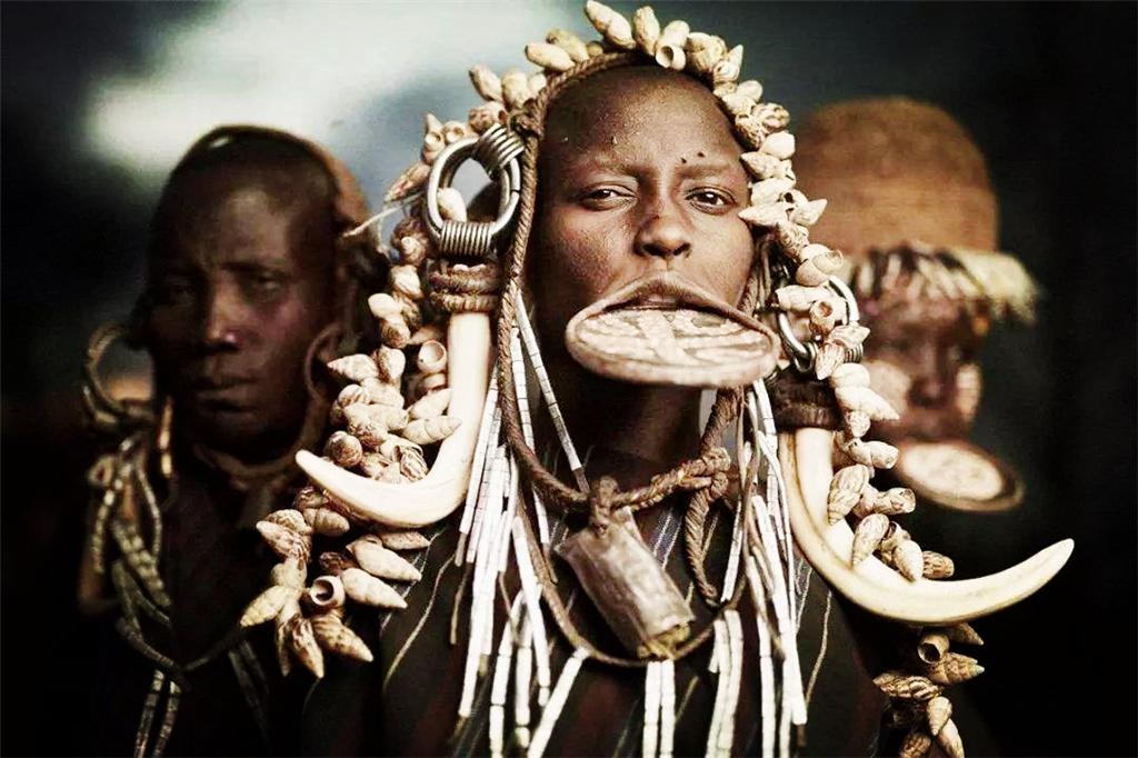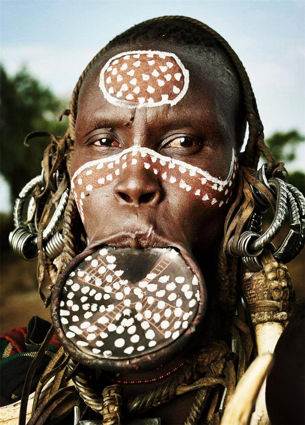 摩尔西族的女人喜欢把自己的下嘴唇拉长透空,然后用泥做的盘子填充支撑,把嘴唇撑得很大很大,形成了大盘子嘴的奇景。在这里,女人以唇部畸形为美,没有唇盘的女人是很难找到理想夫婿的。这个做法其实就像中国以前的小脚女人一样,大脚的女人很难嫁出去的。