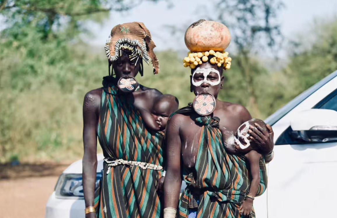 当摩尔西族的少女长到10岁左右时,家里人就会帮她穿透下嘴唇,往嘴唇里放盘子,称为唇盘,盘子用泥土烧制或木块做成。然后,先放一个小盘子把切开的口子撑开,使其不再长回去。随着年龄的增加,逐渐更换大的盘子,嘴唇就会越撑越大,最大的嘴唇能翻到头上把脸包住。唇盘也多种多样:有的上面刻有花纹,有的画着斑点,有的中间透空……色彩斑斓又形状奇特的唇盘让游客大开眼界。
