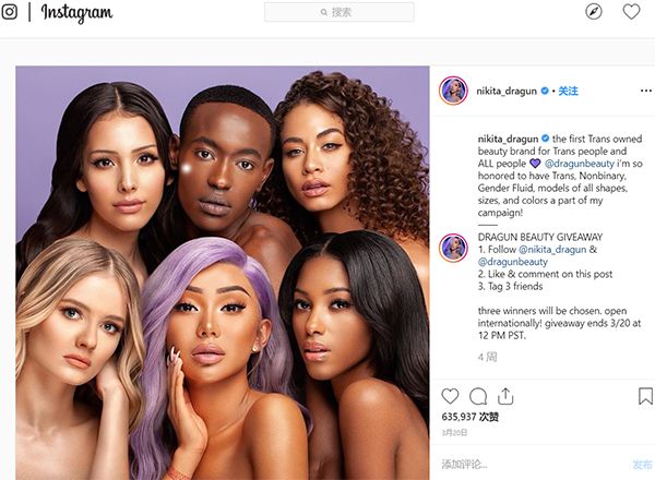 她在Instagram上写道:“这是第一个为跨性别人士及所有人打造的跨性别美妆品牌。我很荣幸能让跨性别、各种大小和不同肤色的模特成为我活动的一部分。”