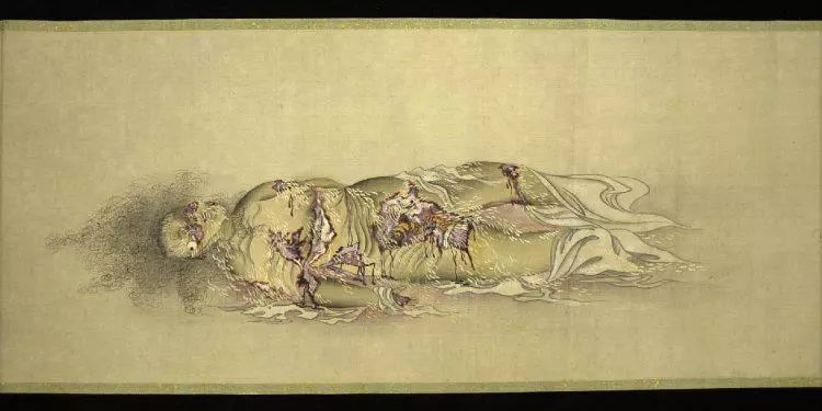 古时艺术家将人死后尸体的腐败过程绘成《九相图》,几幅知名作品收藏于博物馆或寺院,让我们来感受一下: