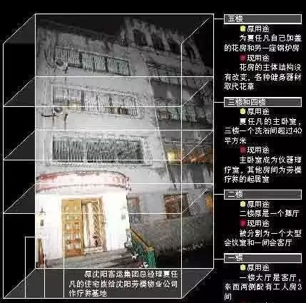 在设计这座豪宅时,各房间内既相互独立,又曲径相连,外人进入时如入迷宫,难辨方位。二楼至五楼由一间高级会客室、七间卧室、书房、花房等组成。楼下200多平方米的小院设有汽车库、油库、健身房、台球室、储藏室、保安室。这座豪宅里曾经住着夏任凡的父亲、女儿、妻子、小保姆、保镖以及其他佣人。夏任凡案发后,夏的妻子、女儿逃往国外,豪宅人去楼空,厨房里留下了大量的海鲜、鱼翅、鱼、肉类、食用油等食品就拉了一卡车,甚至还有一大缸松籽。