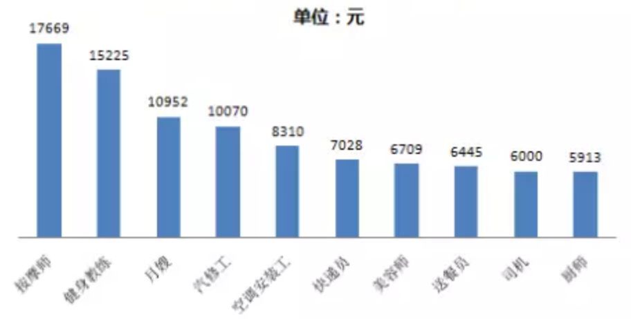 其中位列top10的高薪职位分别为按摩师、健身教练、月嫂、汽修工、美容师、空调安装工、快递员、送餐员、司机、厨师。