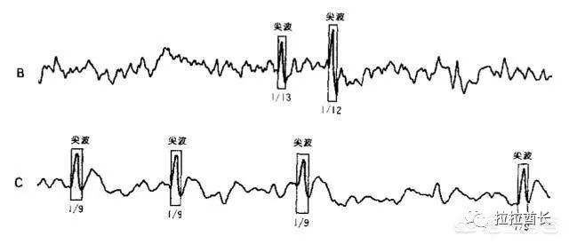 痫样放电的几种波图例:棘波、尖波、棘慢复合波、尖慢复合波。