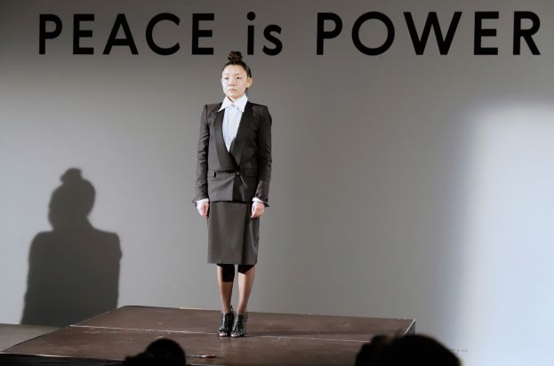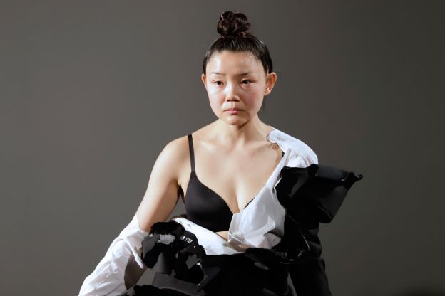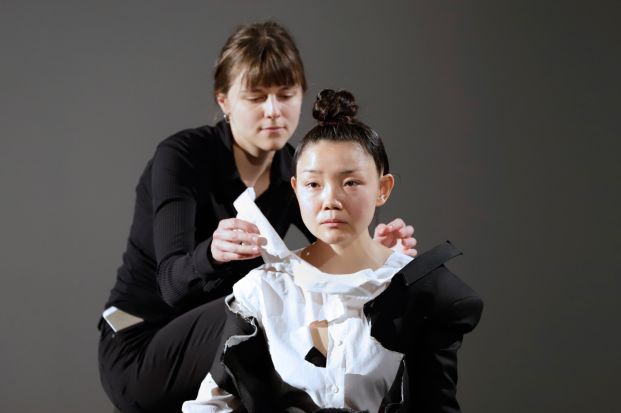 虽然这个开场并不在原始版本的行为执行中,但谢蓉延续了小野洋子每次表演都穿着最好衣服的前例。小野洋子最初穿着的黑色连衣裙来自于伦敦设计师 Biba 的专卖店,在60年代对于当时还不出名的小野洋子来说每次演出都是⼀次牺牲。谢蓉也穿着她最好的正式的设计师礼服:白色的 Dolce&Gabbana 衬衫,黑色的 Prada 裙子,黑色 Armani 西服外套和 Chanel 鞋子。谢蓉告诉我,她将黑色丝袜和高跟鞋的细节添加为女权主义者的声明,而在谢蓉自己的作品⾥,这样女性的衣物是从来没有出现过的。(著名的裸体大提琴艺术家夏洛特·摩尔曼( Charlotte Moorman)在她的多次的《切片》行为表演中都穿着了华丽的舞会礼服)。最后连同所有的衣服碎片,谢蓉的鞋子也被两名观众拿走了,各自拿走一只。