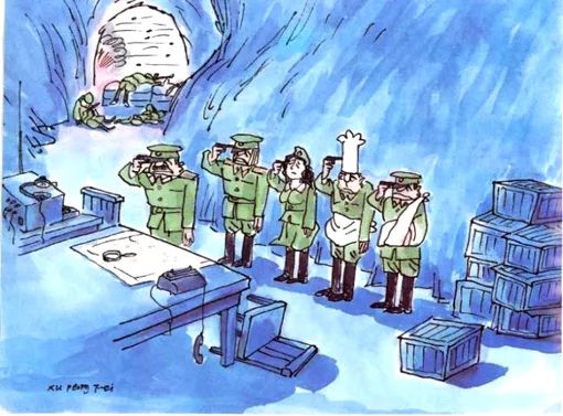 提到他的作品,必然要说一说这幅广为流传的,在1994年获得日本读卖国际漫画大赛“近藤日出造奖”的《偷生》,它描绘了一个战争场面:山洞外枪林弹雨,士兵一个个中弹身亡,洞内一片狼藉,面对失败的战争,几位将士统统举枪对准自己的太阳穴自尽。唯有那个厨师对准自己的高帽子开枪,面临生与死的险境,是坐以待毙,还是谋求生路?想法之独特,实在令人拍案叫绝。