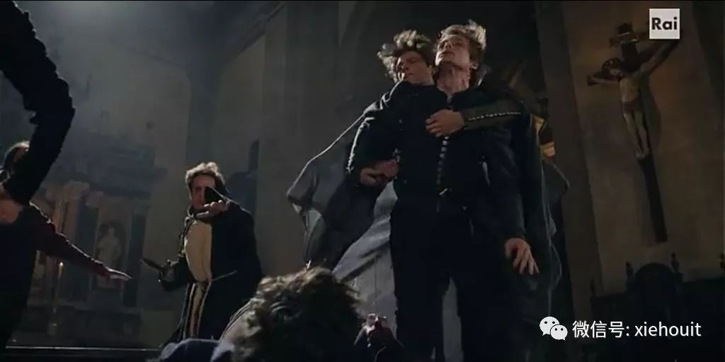 弥撒开始后不久,袭击随之而至,Giuliano 被刺了19刀,头中一剑,失血过多而亡。Lorenzo 负伤逃走,他的好友 Poliziano 帮他藏身在圣器室里,逃过一劫。