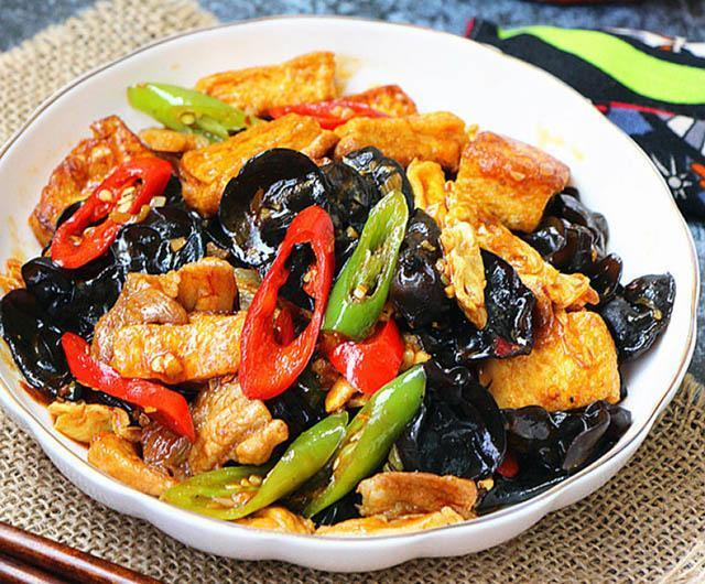 材料:豆腐400克,五花肉100克,鸡蛋2个,木耳10克,杭椒3个,美人椒2个,豆瓣酱1茶匙,白糖少许,生抽、食盐、老抽、葱、姜各适量