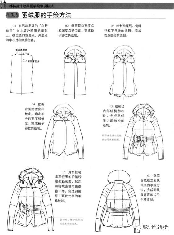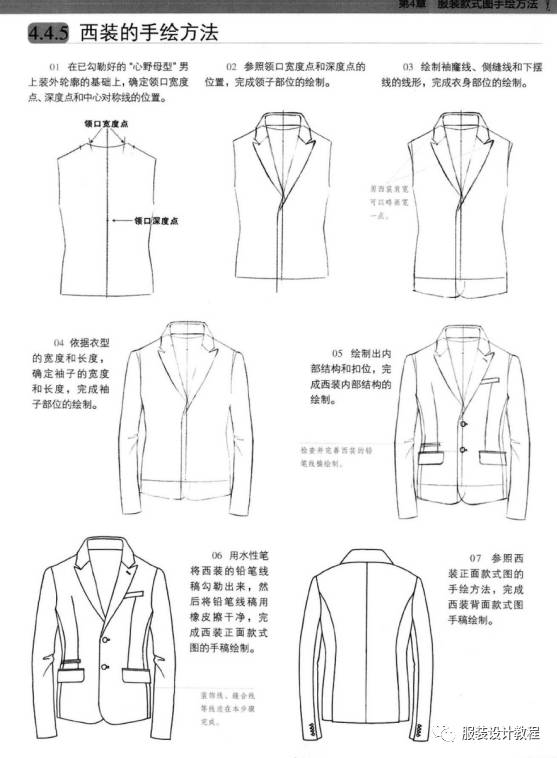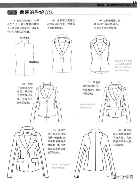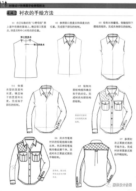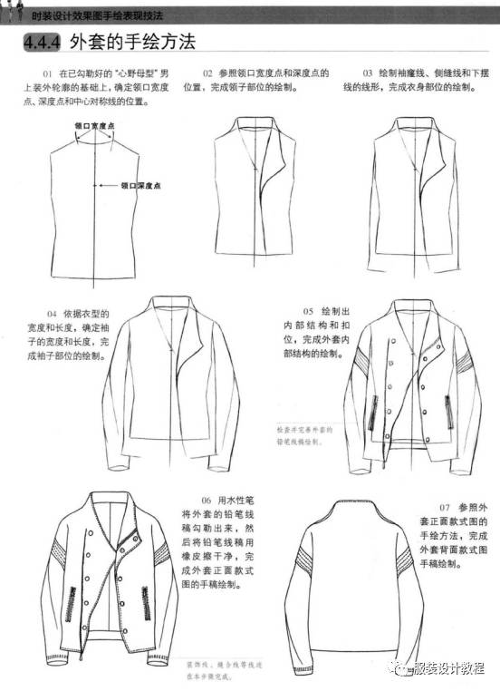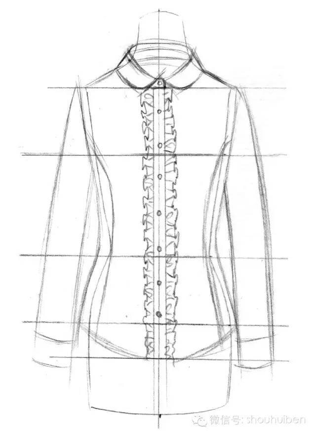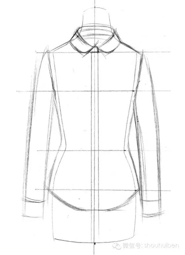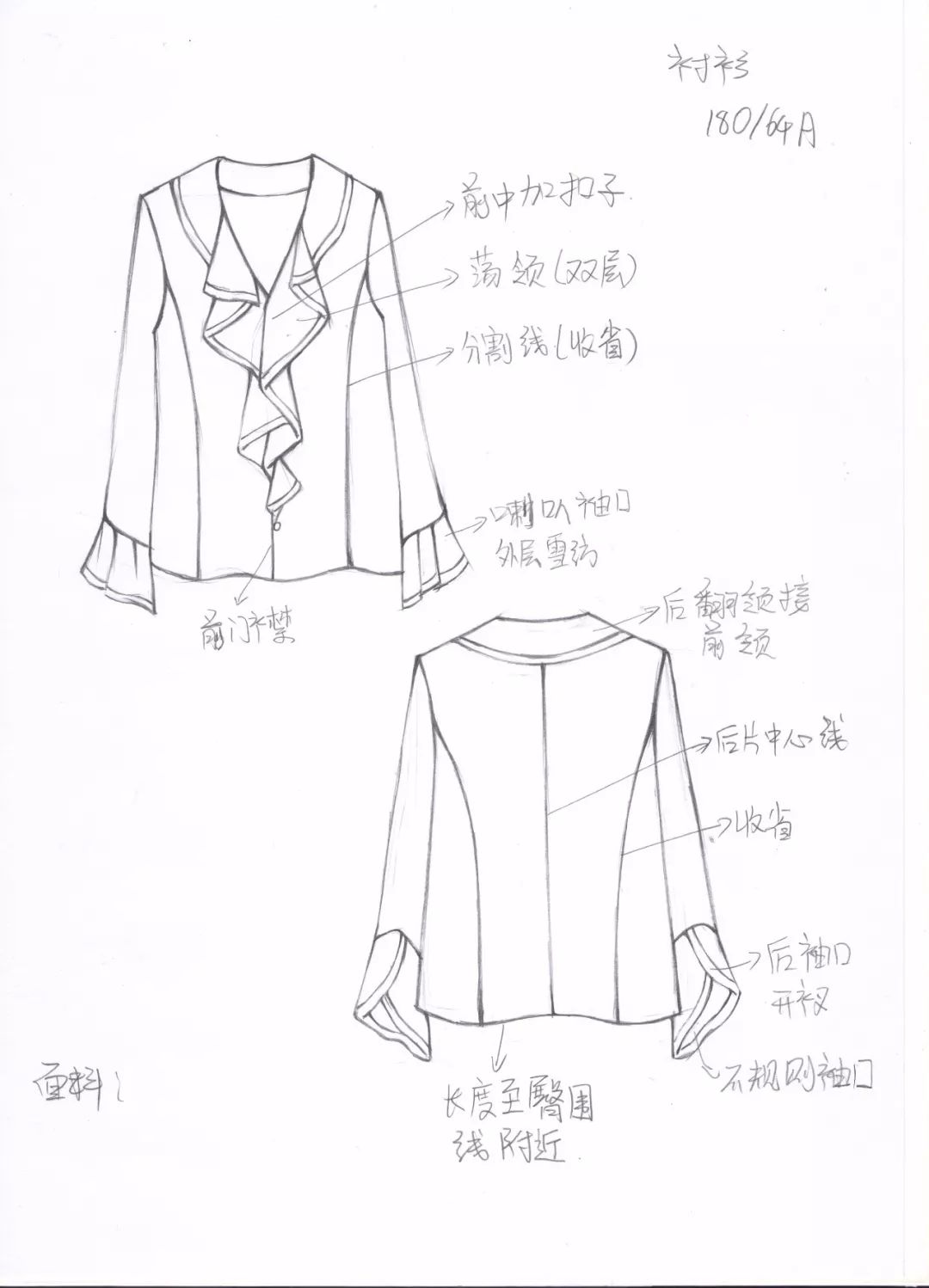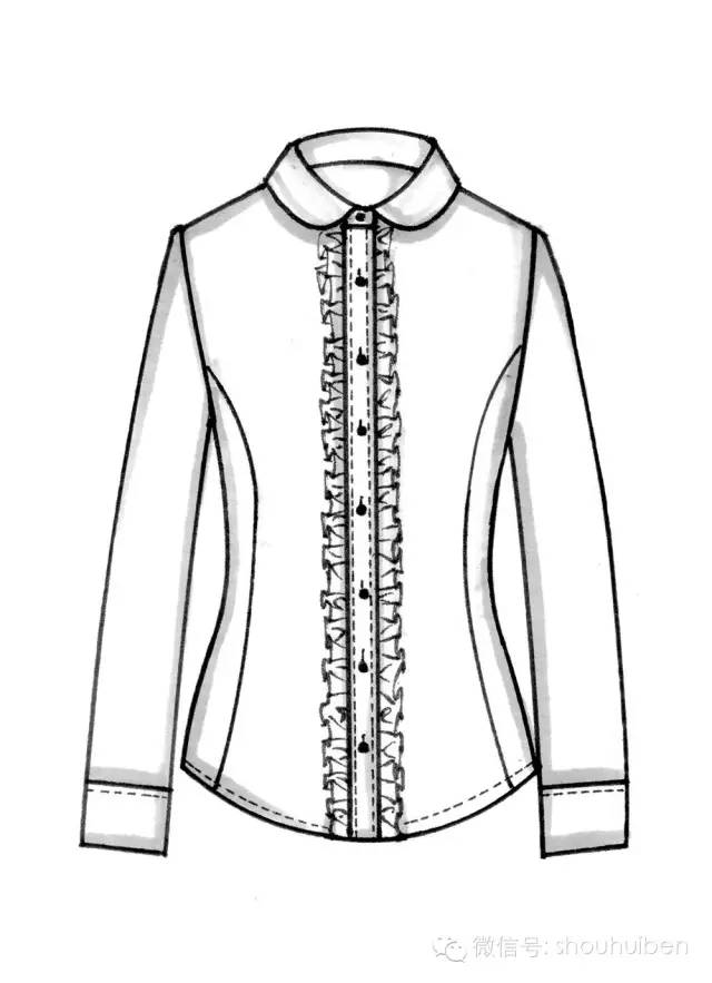绘画的顺序是:领口—门襟—肩—袖窿弧和侧缝—下摆—袖子—内部零部件
