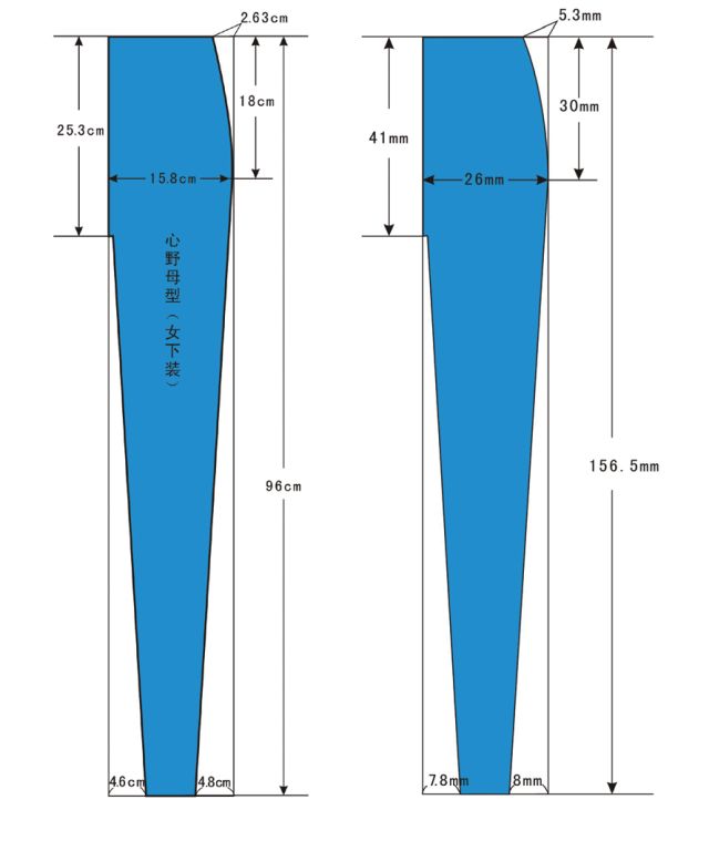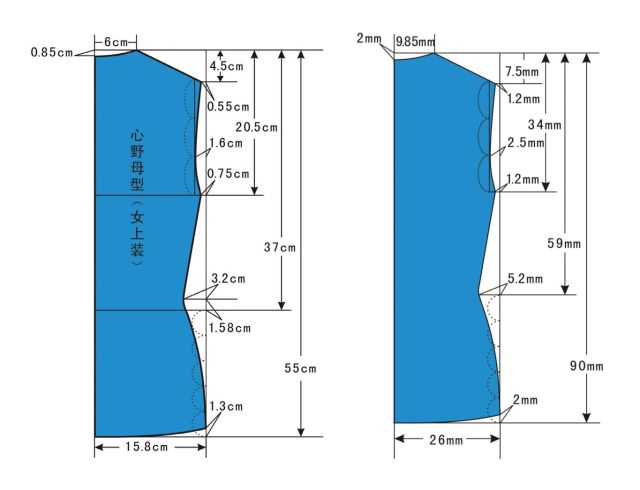 下方各图中的左图为“心野母型”1:1比例数据,下方各图中的右图为笔者示范所用的等比例缩小数据。
