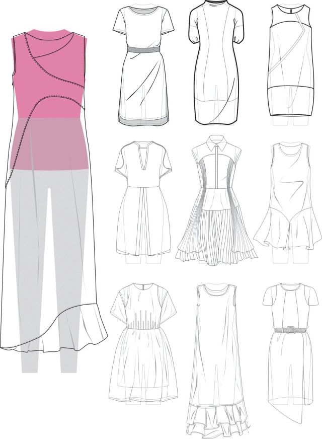 (1)服装款式图要符合人体结构比例,例如肩宽、衣长、袖长之间的比例等。