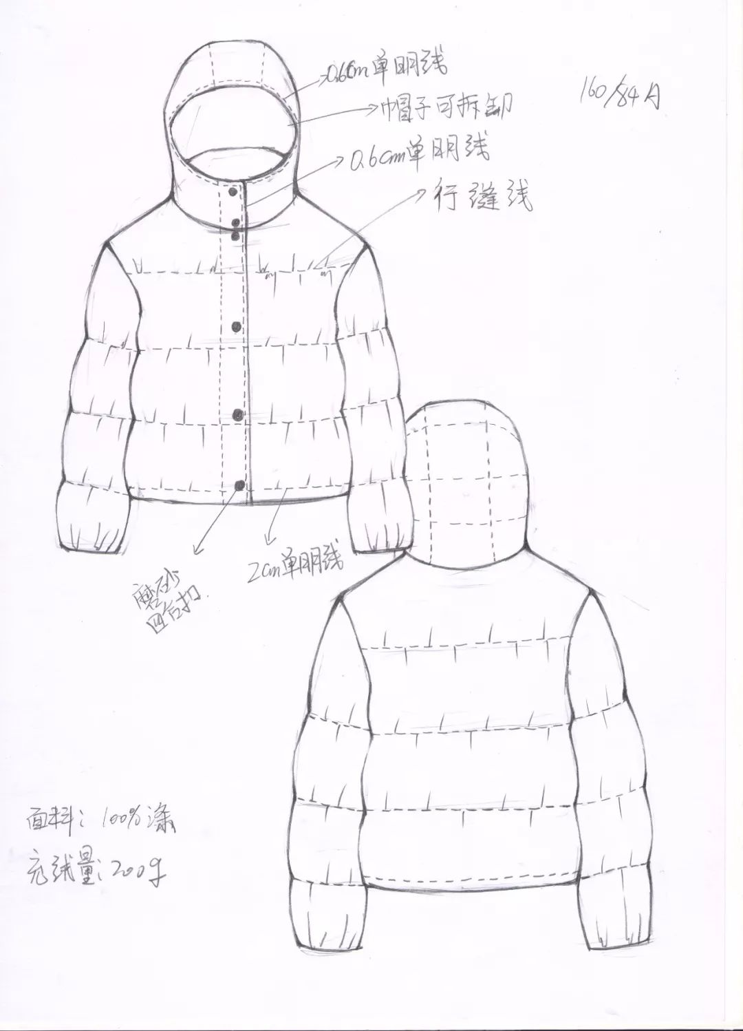 (4)要有一定的文字说明,如特殊工艺的制作、型号的标注、装饰明线的距离、唛头及线号的选用等。