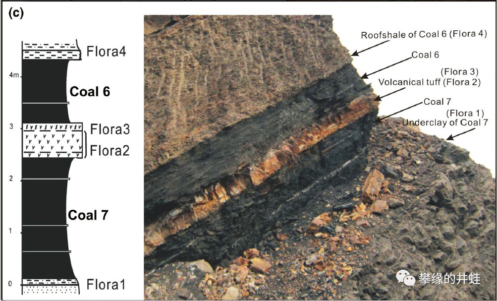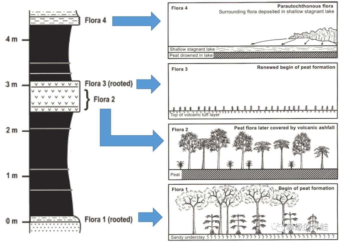 乌达煤田剖面结构和对应的植被类型。从下向上数第二层(Flora 2)就是被火山灰掩埋的泥炭森林。图片来源自[12]。