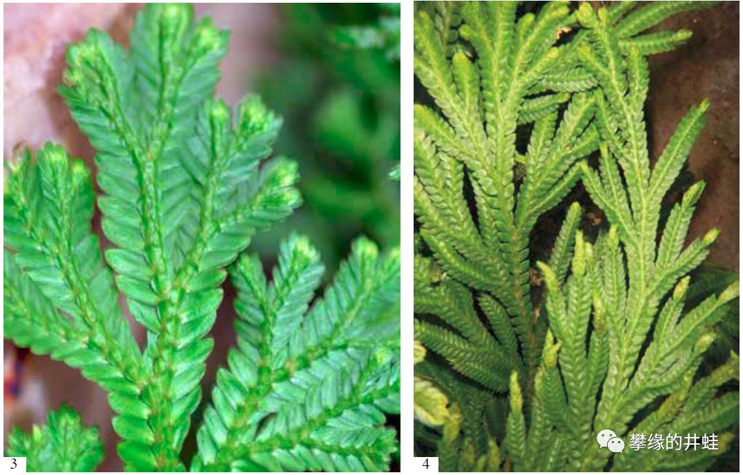 一些现代石松植物的外形。1:小杉兰Huperzia selago(石松目);2:杉叶石松Huperzia Squarrosa(石松目);3:珊瑚卷柏Selaginella martensii;4:小翠云卷柏Selaginella kraussiana。它们保留了祖先的小型叶和二歧分枝模式,像是缩小版的鳞木。外形古朴,别具一格。图片来源自[6]。