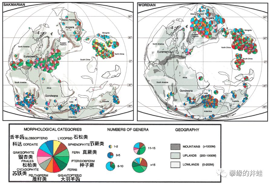 二叠纪早期(左图:萨克马林阶)和二叠纪晚期(右图:沃德阶)各地植被类型统计。泛古大陆中部,赤道两侧的大片森林消失。但在地图右侧,古特提斯海边缘的几座岛屿上,依然生长着茂密的雨林,为石松类提供了宝贵的栖身之地。图片来源自[1]。