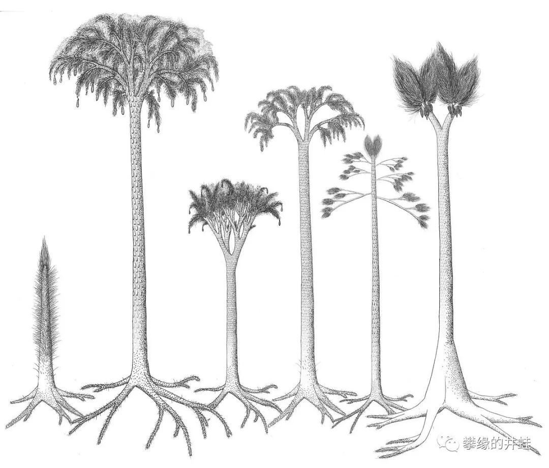 以鳞木和封印木(参见第一百八十四回绿之巨人传1:林网)为代表的巨型木本石松类可以长到50米高,是古生代最巨大的生物。比起低矮的近亲,它们更加依赖潮湿的环境,而二叠纪的泛古大陆上已经没有多少地方可供它们立足。图片来源自网络。