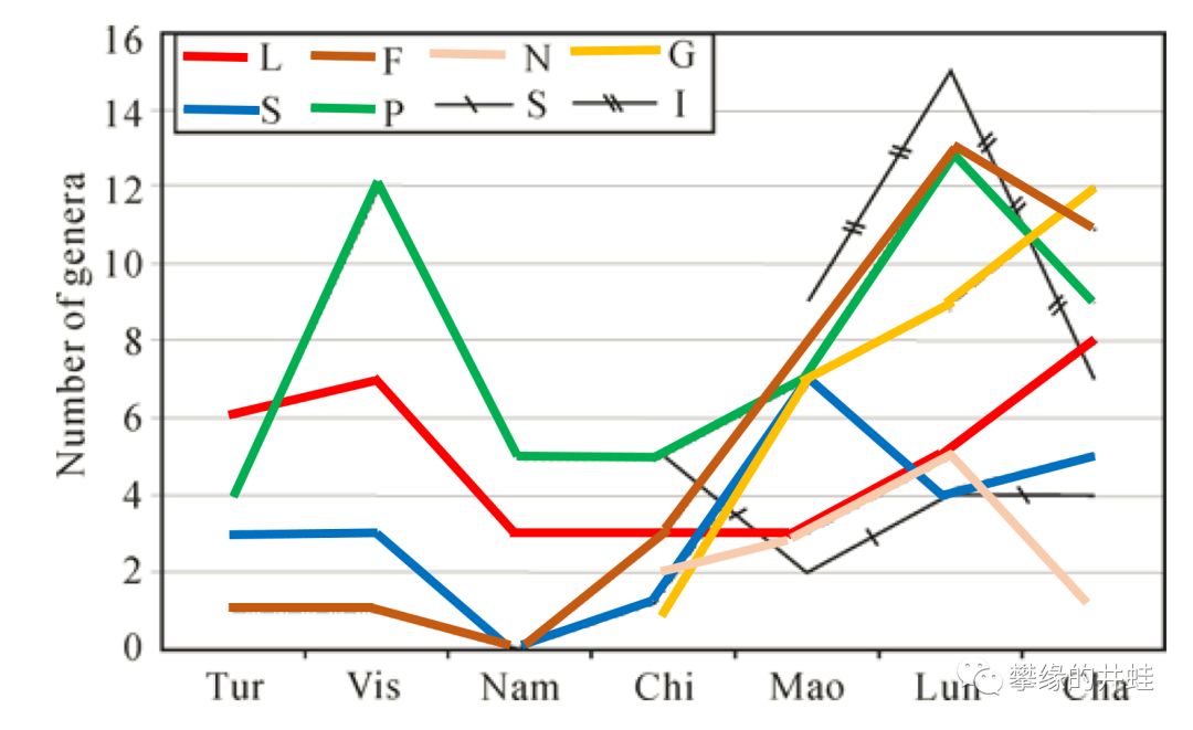 石炭-二叠纪华南板块植物多样性变化情况统计。L:石松类;S:节蕨类;F:真蕨类;P:种子蕨;N:瓢叶类;S:种子化石;G:裸子植物;I:分类不明。在这里,古老的石松植物始终占据着一席之地。图片来源自[10]。
