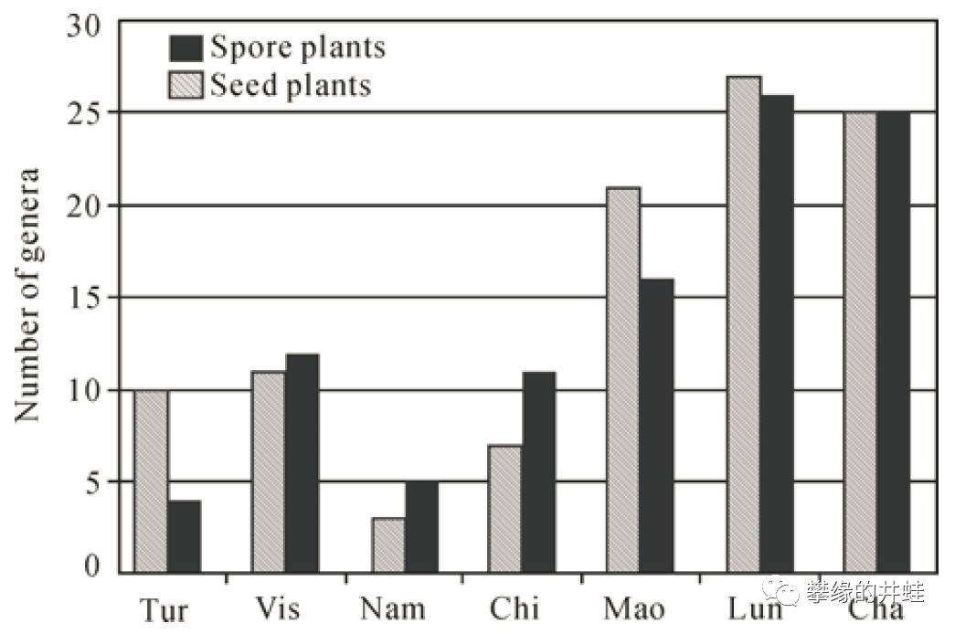 石炭-二叠纪华南板块孢子植物(Spore plants,包括石松类,节蕨类,瓢叶类,真蕨类)和种子植物(Seed plants,包括种子蕨和裸子植物)多样性对比。在湿热的环境中,用种子繁殖的优势并不明显。孢子植物也始终能和种子植物分庭抗礼。图片来源自[10]。