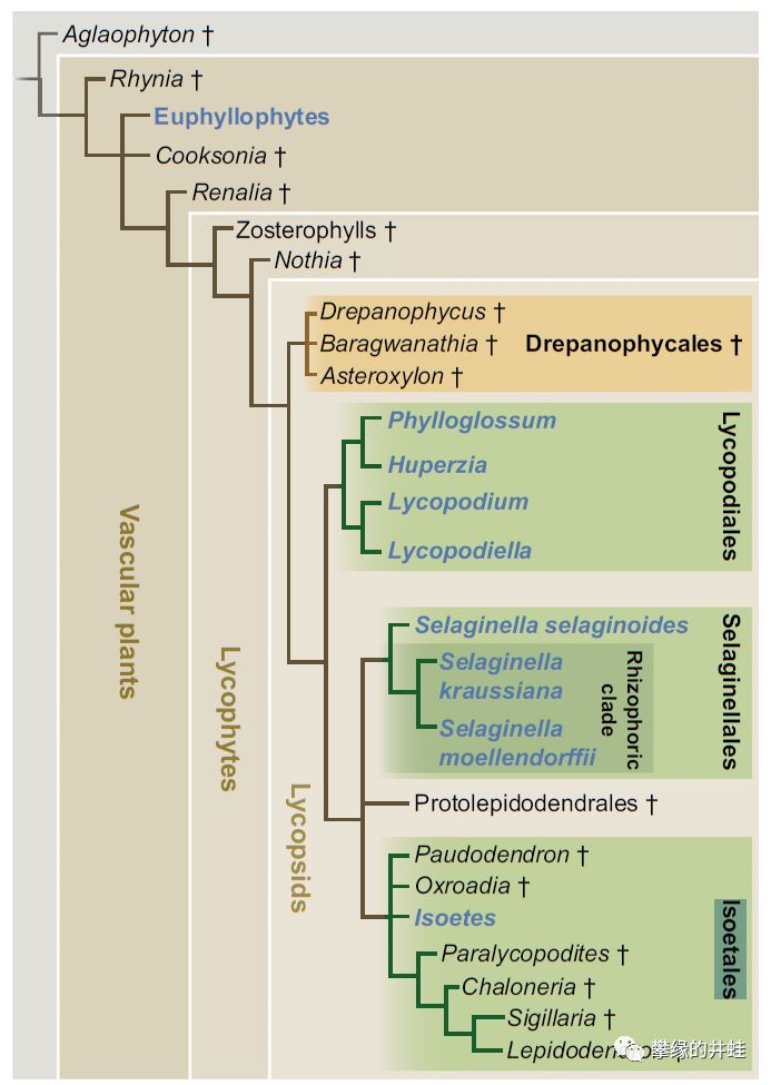 石松植物的系统发育谱图。有三类石松植物幸存到现代:石松目(Lycopodiales),卷柏目(Selaginellales)和水韭目(Isoetales)。现代石松目是同孢植物,卷柏目和水韭目是异孢植物(参见第一百八十八回绿之巨人传4:孢穗)。图片来源自[2]。