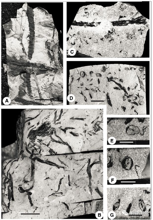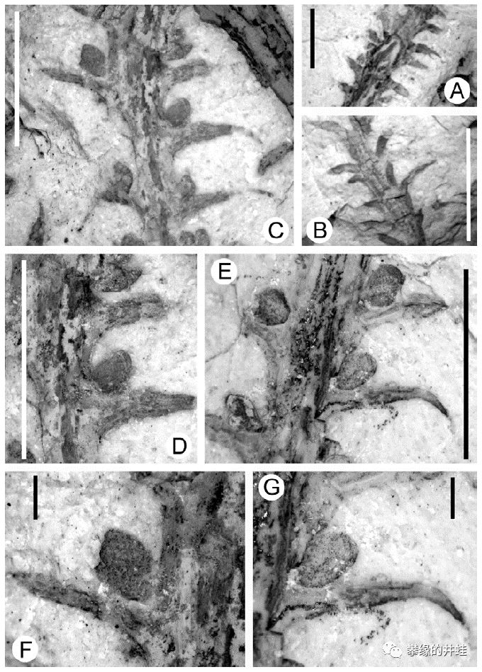 巴西巴拉那盆地(Paraná Basin)发现的早二叠世石松类Lycopodites riograndensis化石。上面保存了小孢子囊和灰尘一样的小孢子(E,G)。图片来源自[3],标尺长度:C图5毫米。