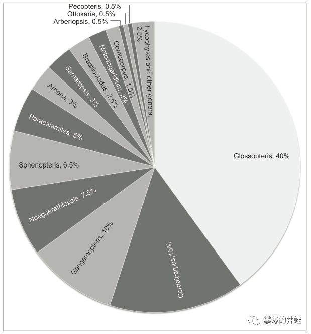 巴拉那盆地各类植物化石统计。石松类只占全部化石的2.5%,这个数字低得让人难以相信,二叠纪才刚刚开始,石松类就匆匆退场了。图片来源自[7]。
