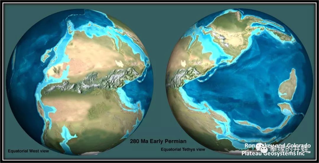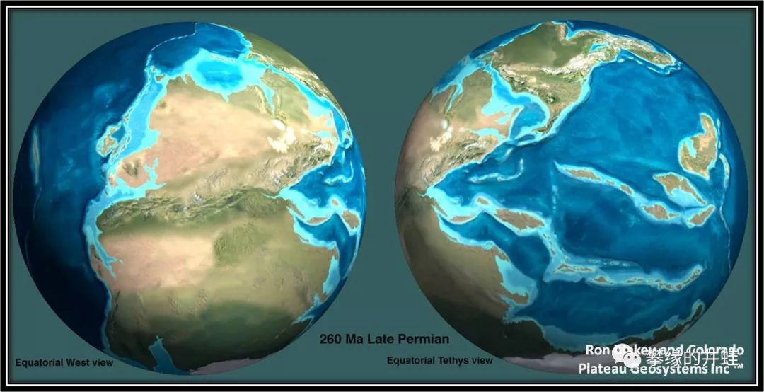 远离泛古大陆的几座孤岛成为巨型石松的最后的避难所。我们再看一下二叠纪的世界地图: