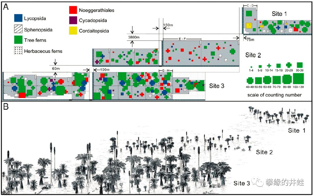 乌达火山灰覆盖区域留下了许多直立状态的树干树桩化石。研究者根据这些化石的种类,大小和位置,绘制了下面的复原图。图片来源自[11]。