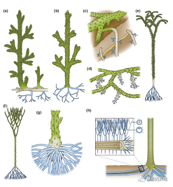 一些古生代石松类植物的根系结构。a,b:星木Asteroxylon mackiei,泥盆纪;c:Cottonwood Canyon lycophyte,泥盆纪;d:镰蕨Depanophycus devonicus,泥盆纪;e:Chamaedendronmultisporangiatum,泥盆纪;f:Longostachyslatisporophyllus,泥盆纪;g:Paurodendron fraiponti,石炭纪;h:木本石松,石炭纪到二叠纪。保留有根系结构的石松类化石并不多,通过它们可以大致勾勒出这类古老植物根系结构的演化过程。石松类的根系有点像现代百合类和棕榈类,并不适合干旱的沙土中生长。图片来源自[2]。